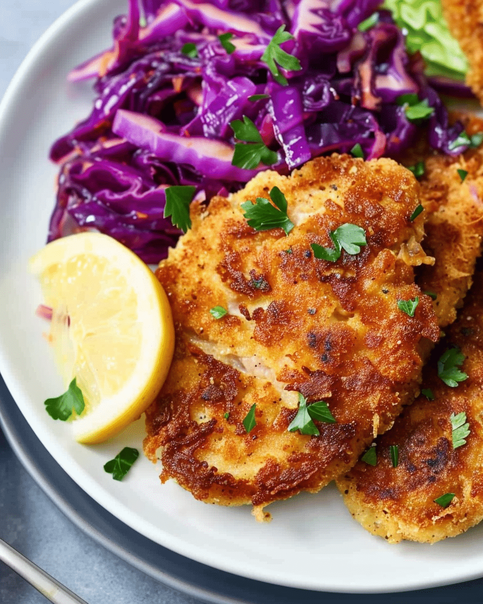 I enjoy this recipe because it feels both hearty and refreshing. The schnitzel comes out perfectly crispy, and I don’t have to deep-fry it. The sweet and sour cabbage side is full of texture and flavor, and I like how it turns the dish into a complete meal. It’s also easy to make and looks impressive when served with lemon wedges and parsley.