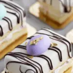 Finally, whisk together confectioners’ sugar, milk or cream, and almond extract for the glaze. Pour over the assembled cakes to coat them evenly with a shiny finish. While the glaze is still tacky, place a Jordan almond on top and drizzle with melted semisweet chocolate for an elegant, bakery-style presentation that will wow your guests.
