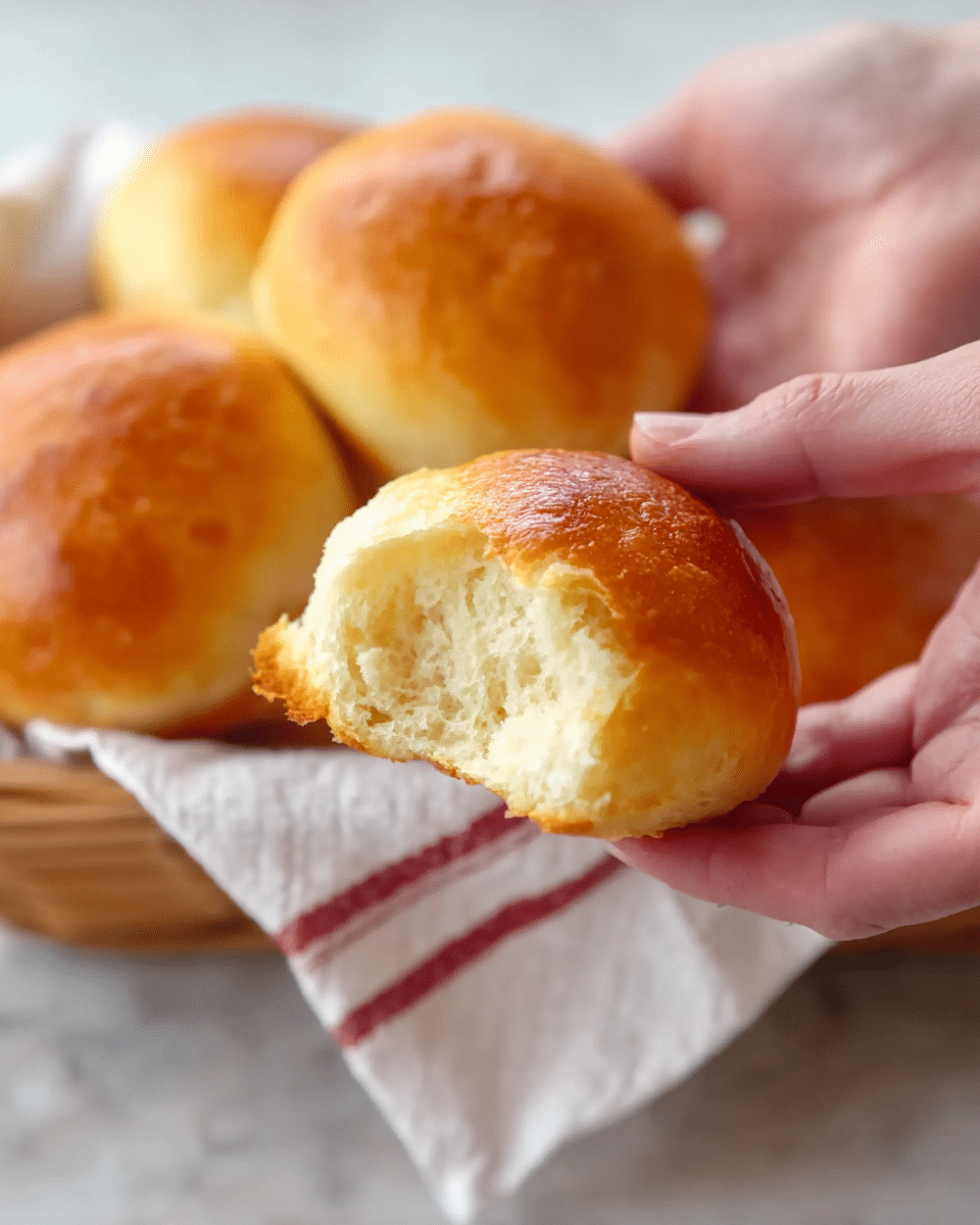 Yes — the dough should be soft and a little sticky. If it’s too stiff, the rolls turn dense.