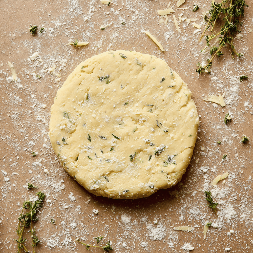 - In a food processor, pulse butter, flour, salt, sugar, shredded cheddar, and thyme until coarse crumbs form.