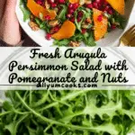 A fresh and vibrant Arugula Persimmon Salad featuring peppery arugula, sweet persimmon slices, crunchy walnuts, pepitas, and juicy pomegranate seeds, all dressed in a simple lemon and olive oil vinaigrette. Perfect as a light lunch or a bright side dish.