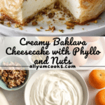 A decadent fusion dessert that combines the flaky, nutty layers of traditional baklava with a rich and creamy ricotta cheesecake. This Baklava Cheesecake features a buttery phyllo crust layered with spiced walnuts and pistachios, filled with a fluffy ricotta and egg batter infused with orange zest and vanilla, then baked to golden perfection and finished with a drizzle of warm honey and extra nuts for a delightful crunch.