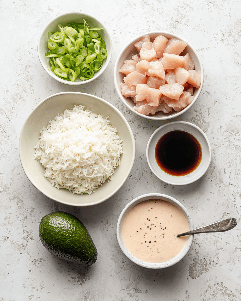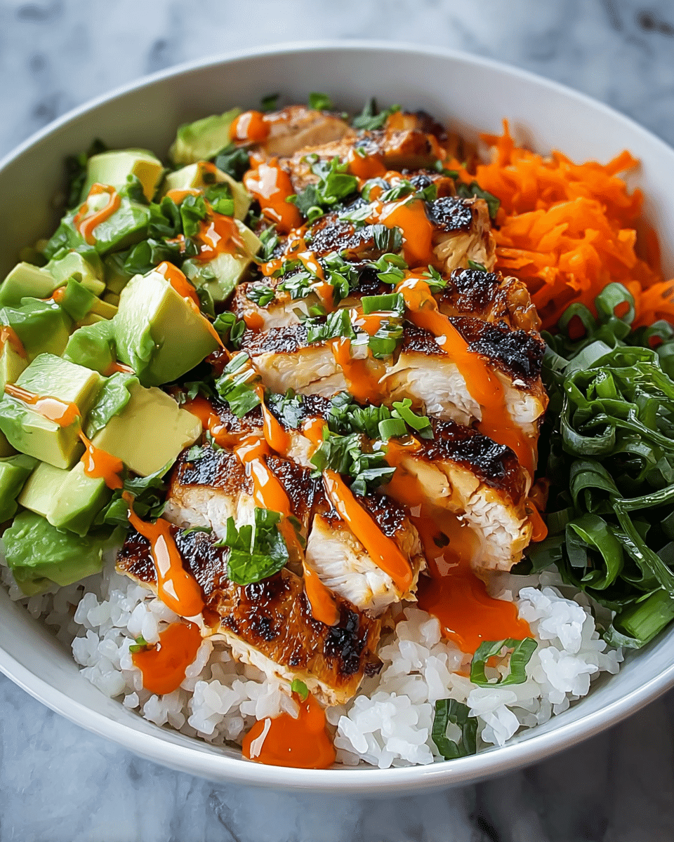 I sometimes swap the chicken for shrimp or tofu for a fun twist. For a lighter version, I use Greek yogurt instead of mayonnaise in the sauce. Adding sliced cucumber, edamame, or purple cabbage also gives the bowl a refreshing crunch and extra color. If I’m craving extra heat, I simply increase the sriracha.