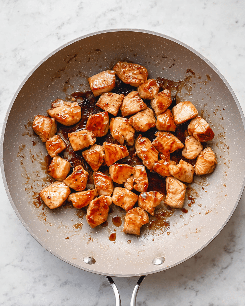 - In a large skillet, I heat the vegetable oil over medium-high heat and add the chicken, cooking until it’s golden brown and fully cooked through, about 6–8 minutes.