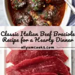 This classic Beef Braciole recipe features tender top round slices stuffed with a flavorful garlic, parsley, and cheese filling, rolled and simmered in a rich tomato and red wine sauce until perfectly tender. Slow-cooked in the oven or stovetop, this Italian dish makes a comforting main course served best over pasta, potatoes, or polenta.