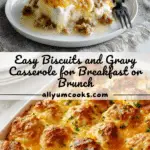 A hearty and comforting Biscuits and Gravy Casserole combining flaky biscuit dough, savory sausage gravy, fluffy eggs, and melted Colby Jack cheese baked to perfection for a delicious breakfast or brunch.