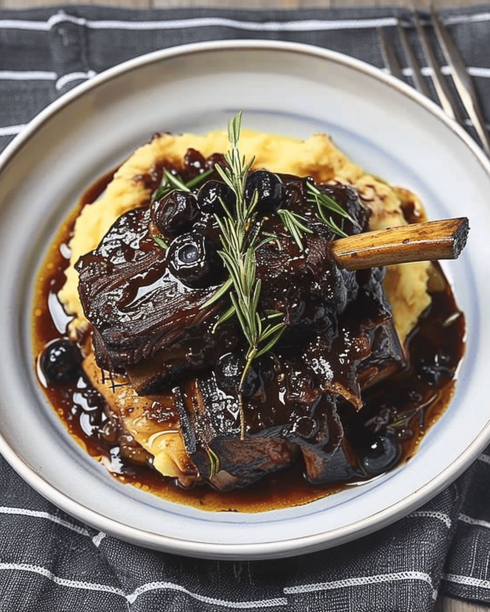 Tender beef short ribs braised in a rich sauce of blueberries, balsamic vinegar, and red wine. A comforting yet elegant dish with a balance of savory, sweet, and tangy flavors.