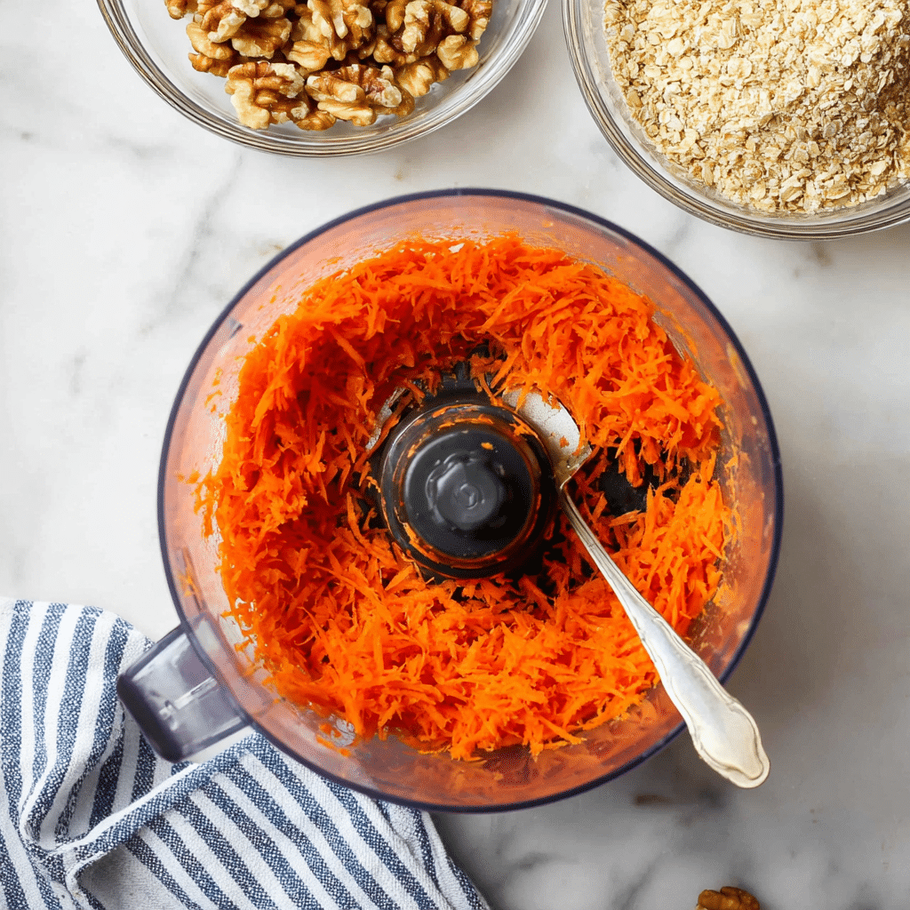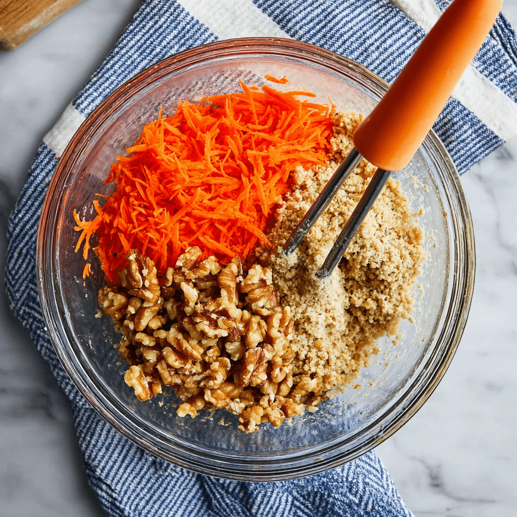 - Fold in grated carrots, shredded zucchini, and chopped pecans.