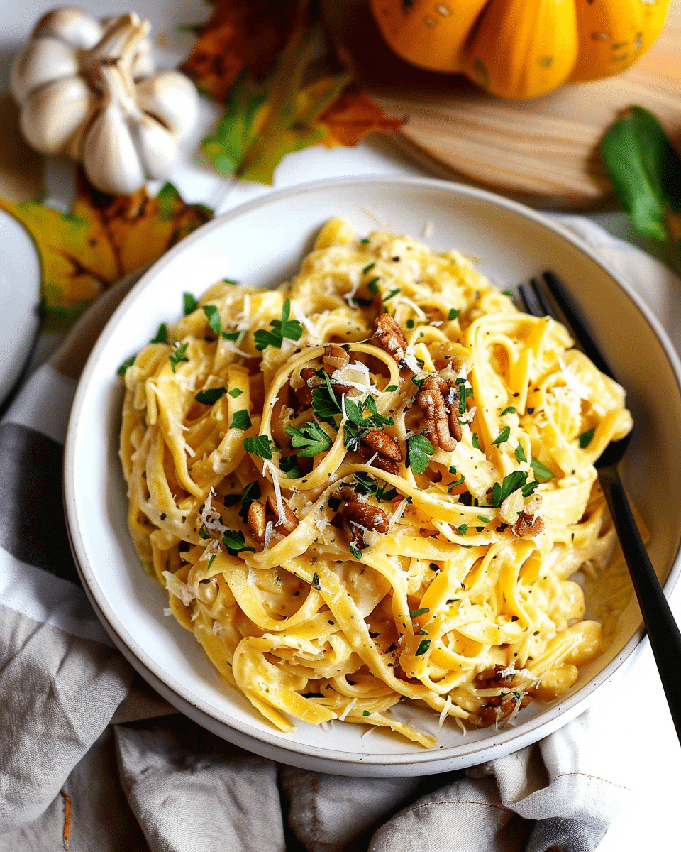 A creamy and comforting twist on classic Alfredo pasta, combining tender fettuccine noodles with a luscious pumpkin and cauliflower sauce, aromatic herbs, Parmesan cheese, and topped with toasted pecans and fresh parsley for a satisfying vegetarian-friendly meal.