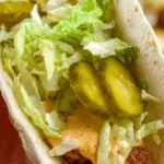 While the chicken cooks, warm your flour tortillas in a dry pan or wrap them in foil and heat in the oven briefly until soft and pliable. To assemble each taco, layer shredded lettuce as a base, place a crispy chicken tenderloin on top, add a slice of American cheese (which will melt slightly from the chicken’s warmth), then pile on 3 dill pickle slices. Finish generously with the special sauce, the final touch that brings all the flavors together. Fold taco-style and get ready for a taste sensation.