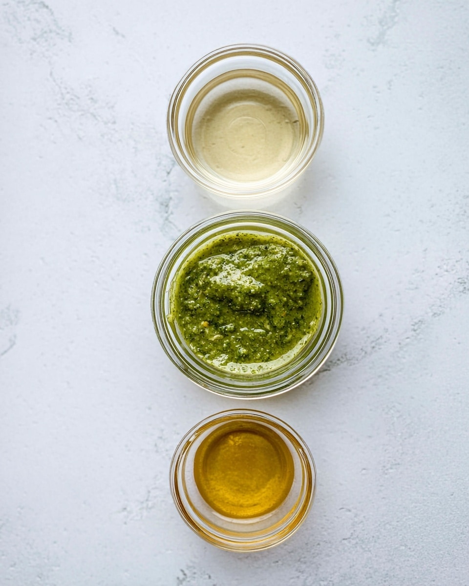 - Whisk together pesto, ¼ cup olive oil, and rice wine vinegar to make the pesto vinaigrette.