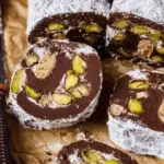 Chocolate Salami is a no-bake, indulgent dessert resembling a salami log made from bittersweet and semi-sweet chocolates combined with crunchy Biscoff cookies, toasted pistachios, and dried cranberries. Flavored with Grand Marnier and dusted with confectioners’ sugar, this easy-to-make treat is perfect for serving at parties or as a decadent snack.