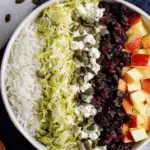 A refreshing and vibrant Cranberry Apple Salad featuring tender basmati rice, crunchy shredded Brussels sprouts, sweet dried cranberries, crisp apples, roasted pumpkin seeds, and tangy feta cheese, all tossed in a zesty lemon-Dijon dressing. Perfect as a light meal or a nutritious side dish.