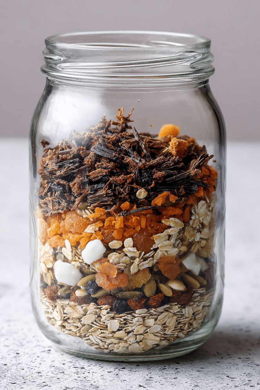 - Combine oats, grated carrots, chia seeds, cinnamon, nuts, coconut, raisins, and a pinch of salt in a jar or airtight container.