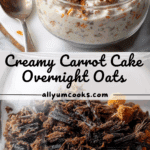 Creamy carrot cake overnight oats are a wholesome, make-ahead breakfast that tastes like dessert but is packed with nourishing ingredients. Spiced with cinnamon, sweetened with raisins and maple syrup, and finished with crunchy nuts and coconut, it’s a convenient and indulgent way to start the day.