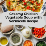 This Creamy Chicken Vegetable Soup is a comforting and hearty meal featuring tender shredded chicken, fresh vegetables, and tender vermicelli noodles in a rich, flavorful broth. Slow-simmered chicken broth forms the base, enhanced with aromatic spices and brightened with parsley. Perfect for a warming lunch or dinner, this soup combines a creamy texture with wholesome ingredients for a nourishing dish.