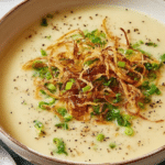 If you crave a comforting bowl of warmth that’s both indulgent and satisfying, this Creamy Potato Soup with Crispy Potato Skins Recipe is exactly what you need. Combining velvety smooth potato soup with the irresistible crunch of crispy fried potato skins, it creates a beautiful harmony of textures and flavors. The luscious creaminess enriched with fresh thyme, brightened by lemon juice, and perfectly seasoned with a touch of garlic and Dijon mustard makes this dish an instant favorite. Whether you’re looking for a cozy weeknight dinner or a stunning starter for guests, this soup will hug your taste buds and fill you up with joy.