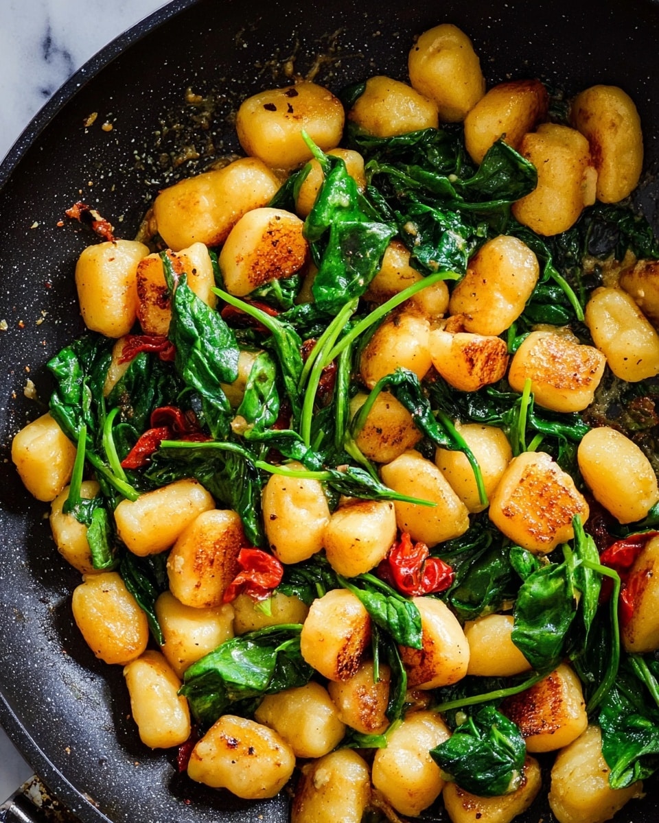 A quick and comforting skillet meal featuring crispy pan-fried gnocchi, creamy spinach, and tangy feta cheese in a light, flavorful sauce—ready in under 30 minutes.