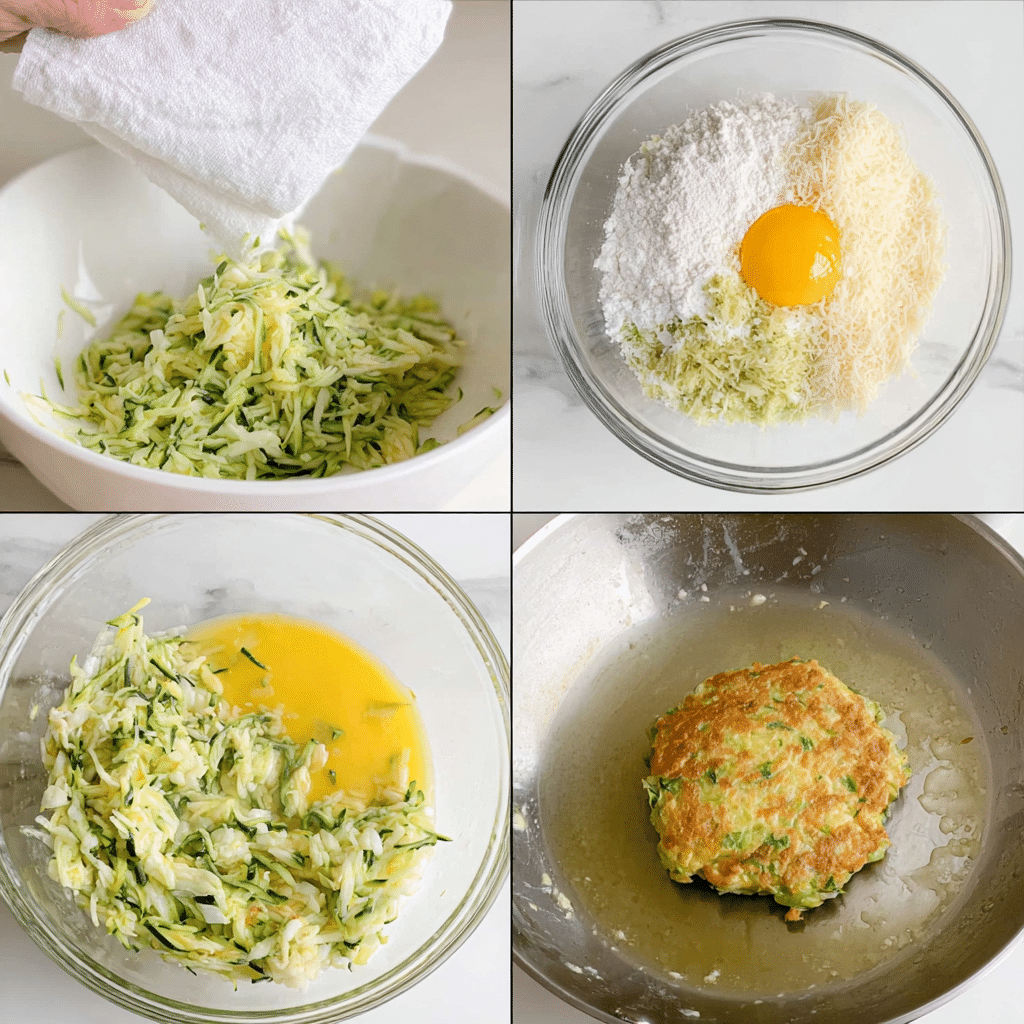- Grate the zucchini and place it in a colander. Sprinkle with ¼ teaspoon salt and let rest for 10 minutes to draw out excess moisture.