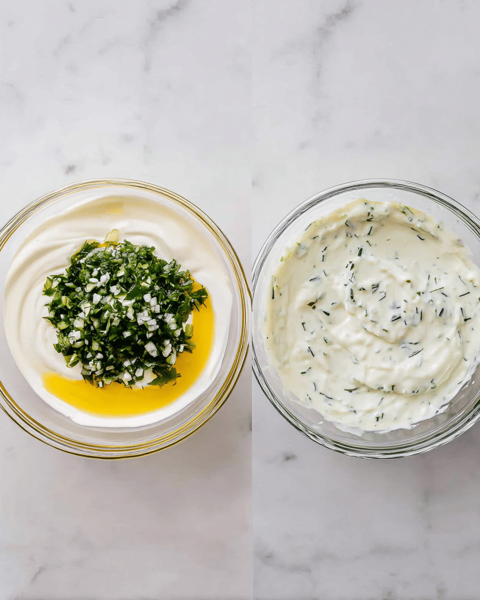 - While frying, prepare the lemon yogurt sauce by whisking together Greek yogurt, lemon juice, zest, garlic, and salt until smooth.