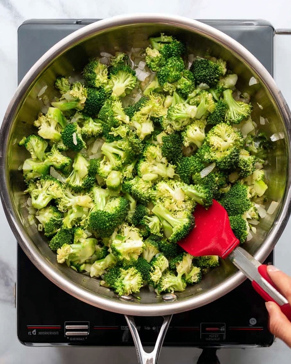 - Add chopped broccoli and cook for 2–3 minutes until bright green and slightly tender.