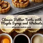 Delight in these classic Butter Tarts featuring a flaky pie crust filled with a luscious, sweet mixture of brown sugar, maple syrup, and butter, enhanced with vanilla and optional walnuts and raisins for added texture and flavor. Perfectly baked to golden perfection, these tarts offer a rich, gooey center with a buttery crust that makes for an irresistible treat.