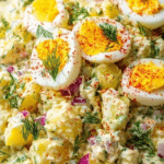 For an eye-catching final touch, garnish your potato salad with halved hard-boiled eggs and fresh diced dill. The eggs highlight the deviled egg inspiration and add an elegant touch, while the dill brings a refreshing, herbal note that lifts the whole dish.