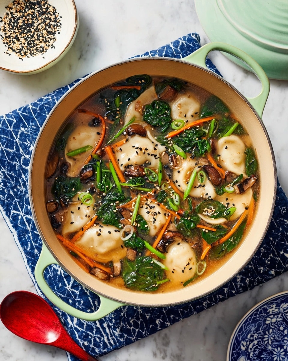 A quick, cozy dumpling soup featuring tender dumplings, earthy shiitake mushrooms, and fresh spinach in a fragrant tamari-ginger broth. Balanced with bright lime and rice vinegar, this comforting soup comes together in under 30 minutes and is perfect for weeknight warmth.