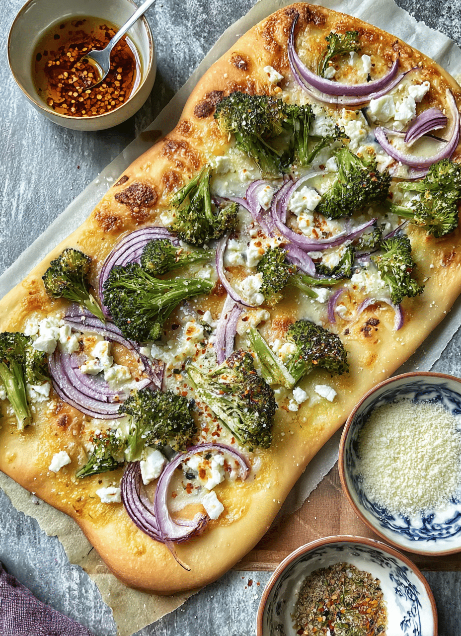 A bold and flavorful homemade pizza topped with roasted broccolini, mozzarella, feta, and parmesan, finished with a kick of crushed red pepper flakes. Crispy, cheesy, and ready in just 30 minutes.