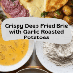 This Easy Deep Fried Brie recipe features a crispy, golden crust surrounding a luscious, melted wheel of Brie cheese. Paired with perfectly roasted baby potatoes, sliced saucisson, cornichons, and fresh bread, it makes a delightful appetizer or snack that’s both indulgent and satisfying.