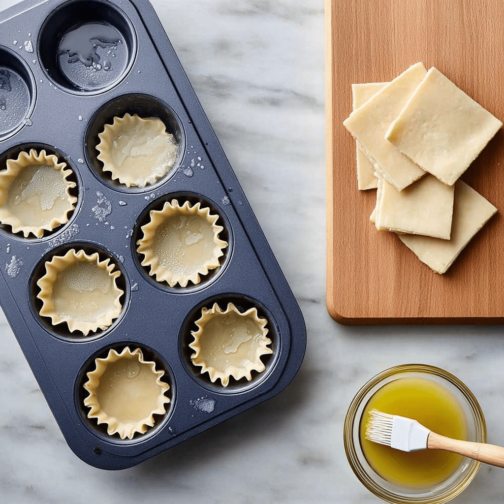 - Press one wonton wrapper into each muffin cup to form a base.