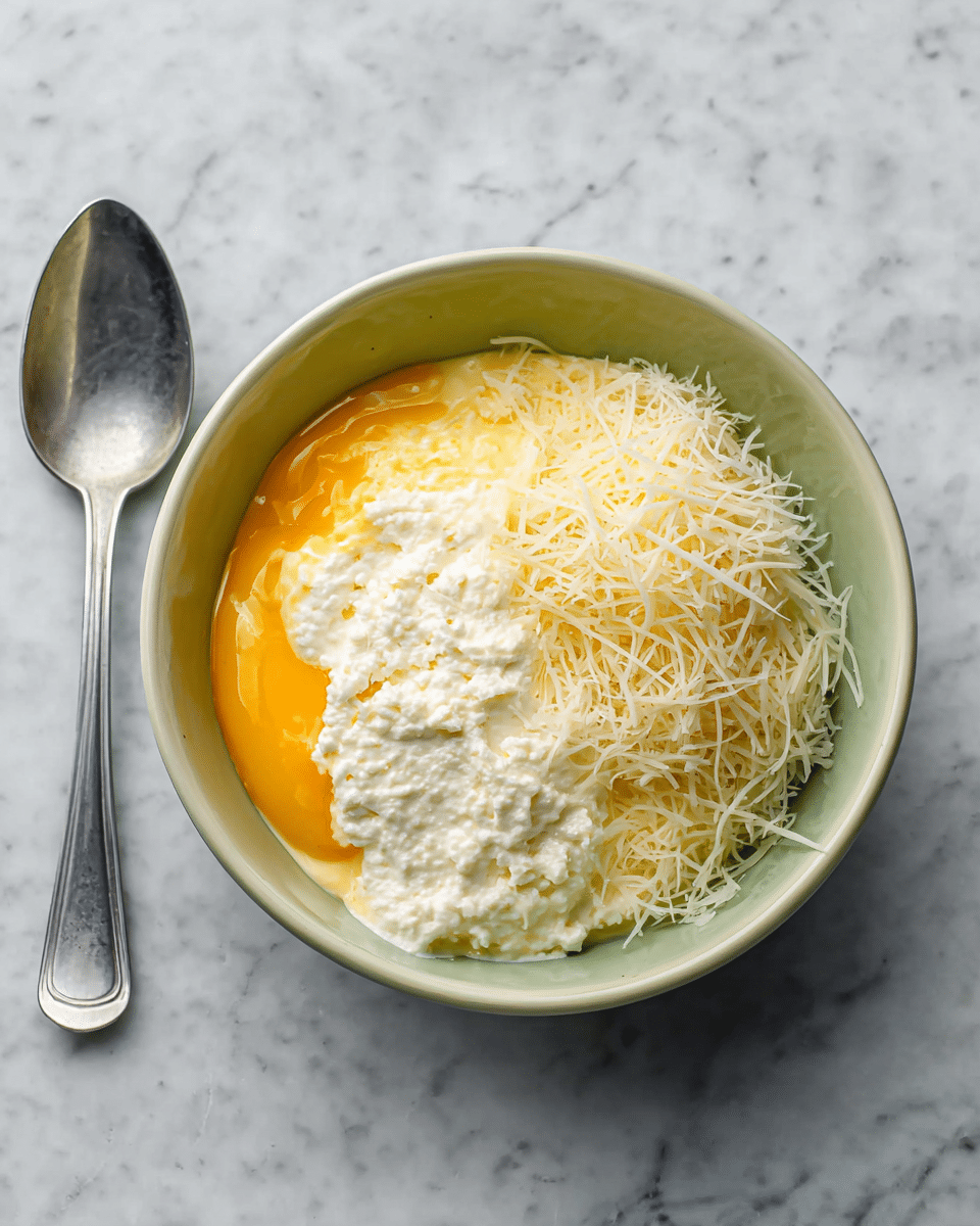 - In a small bowl, I mix the ricotta cheese with half of the Parmesan cheese and a pinch of salt for extra flavor.