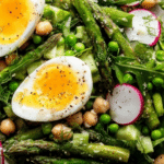 A fresh and vibrant spring salad featuring sautéed asparagus, roasted chickpeas, crispy toasted pine nuts, and a medley of fresh herbs. Tossed with a zesty lemon Dijon dressing and topped with feta cheese and hard boiled eggs, this salad offers a delightful balance of textures and bright flavors perfect for a light lunch or side dish.