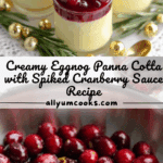 A creamy and festive Eggnog Panna Cotta topped with a tangy spiked cranberry sauce, combining the warmth of holiday eggnog with a bright citrusy twist. Perfect make-ahead dessert for holiday gatherings.