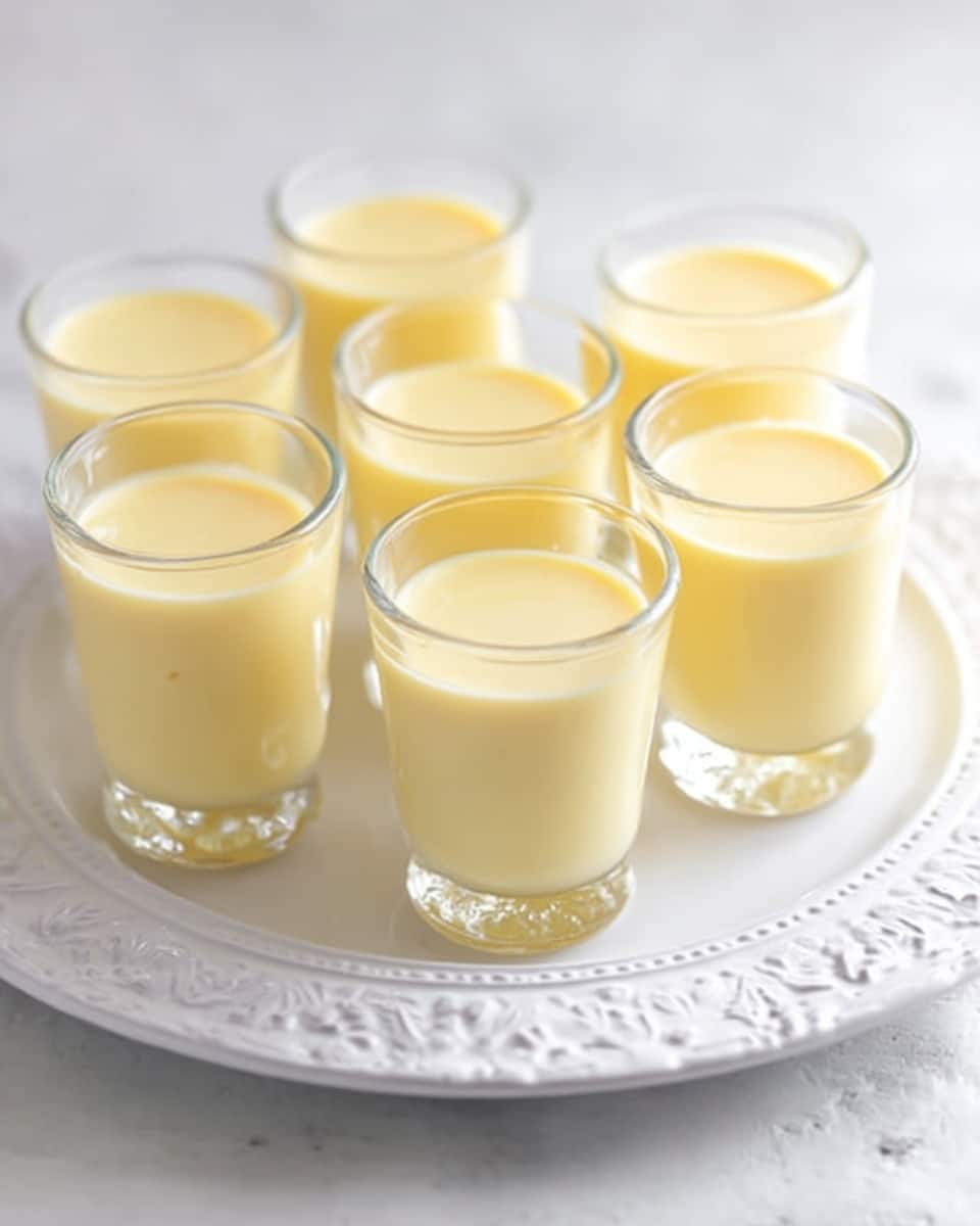 - Place six 4-oz dessert glasses on a baking sheet (for easy handling). Pour about 1/3 cup of the eggnog mixture into each glass. Transfer the baking sheet with the glasses into the refrigerator and chill for about 2 hours (or until firmly set).