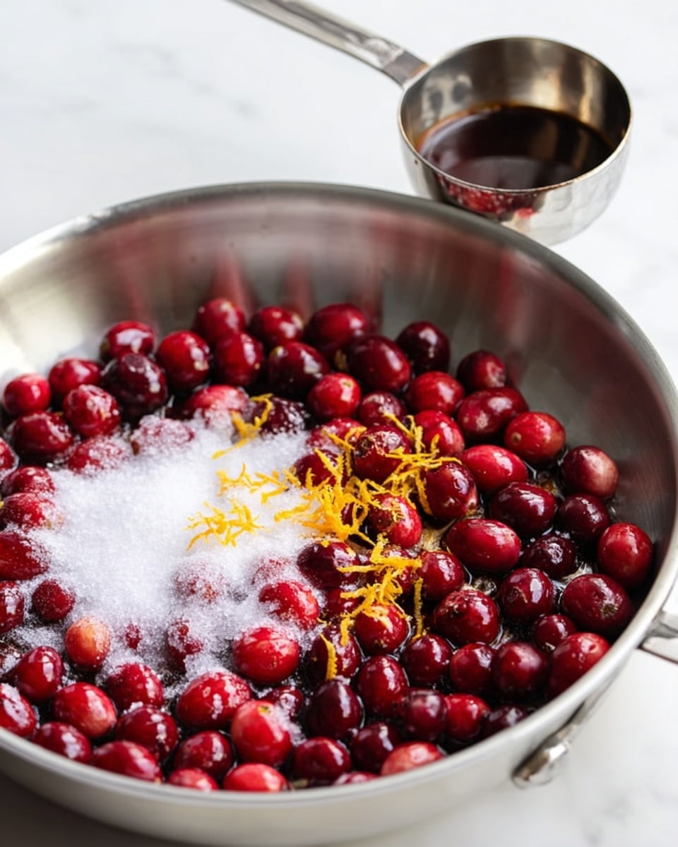 - For the cranberry sauce, combine cranberries, sugar, orange zest, and orange juice in a medium saucepan. Bring to a boil, then reduce to a simmer and mash the berries until broken down.