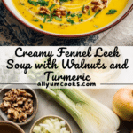 This vibrant Fennel Leek Soup with Walnuts & Turmeric is a comforting, creamy vegetable soup packed with subtle sweetness from apples, earthy warmth from turmeric, and a delightful crunch from toasted walnuts. Perfect for a nutritious lunch or light dinner, this easy-to-make soup uses simple ingredients blended to smooth perfection and garnished with fresh fennel fronds, maple syrup, and extra walnuts for added texture and flavor.