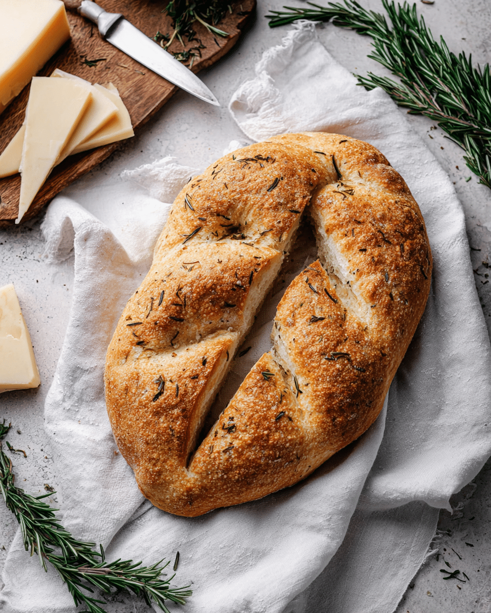 Rustic French fougasse bread shaped like a leaf, with a crisp crust, chewy interior, and fragrant toppings of olive oil, Parmesan, and rosemary.