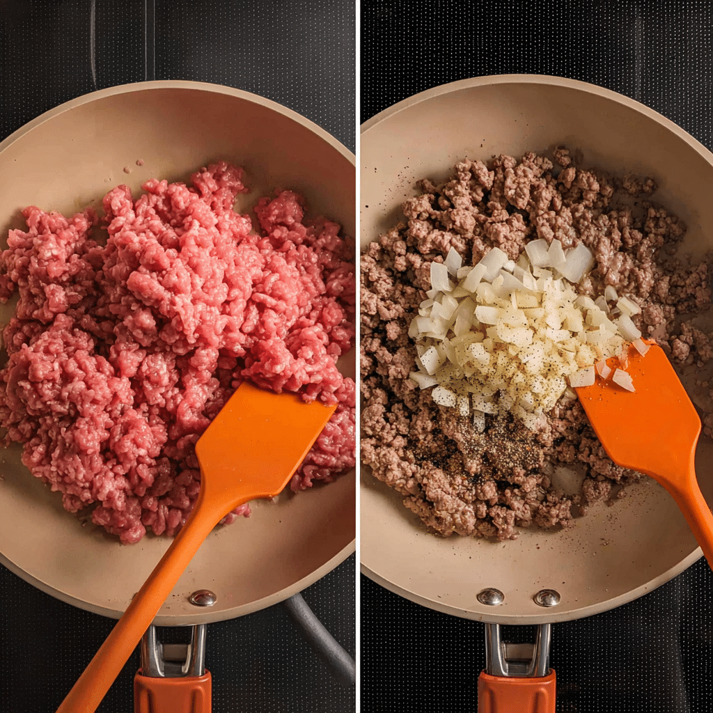 - Add ground beef and cook until browned, breaking it apart as it cooks. Drain excess grease if needed.