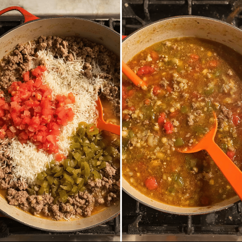- Next, I add the uncooked rice and stir it into the beef mixture, letting it toast slightly for about a minute.