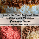 A rich and comforting one-pan Garlic Butter Beef and Rice Skillet made with savory ground beef, fluffy rice, and a creamy cheddar-parmesan sauce. A quick, hearty meal perfect for busy weeknights.
