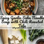 A vibrant and flavorful vegetarian dish featuring chewy soba noodles in a garlicky vegetable broth, topped with spicy chili-roasted tofu and fresh kale. Perfectly balanced with zesty lime and aromatic garlic for a warming and nutritious meal.