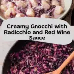 A rich and comforting gnocchi dish featuring slightly bitter radicchio sautéed and simmered in a creamy red wine sauce, topped with grated Parmesan for a delightful blend of flavors and textures.