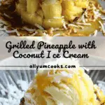 A tropical dessert featuring caramelized grilled pineapple topped with creamy vanilla ice cream, rich caramel sauce, and shredded coconut for a refreshing yet indulgent treat.