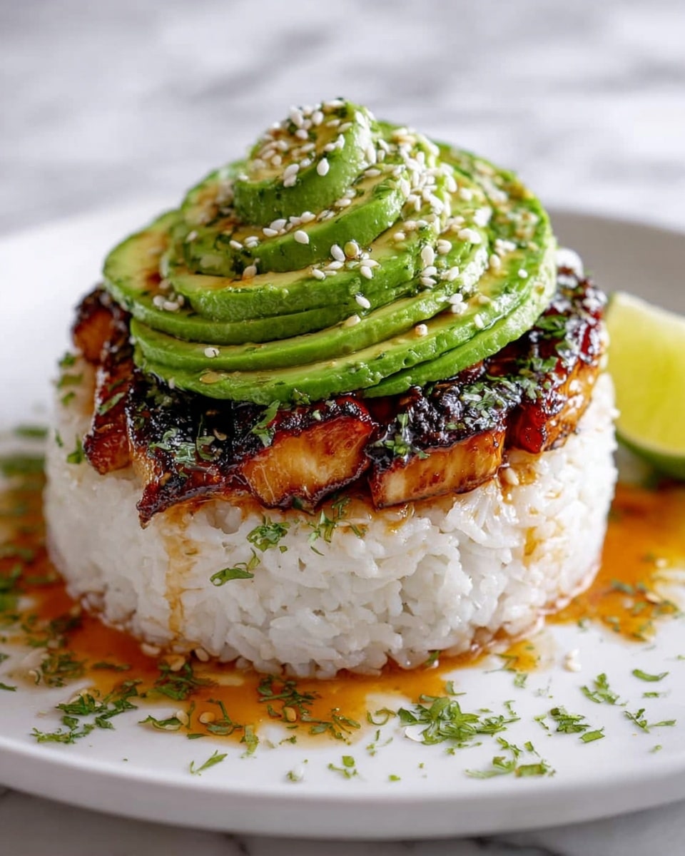A vibrant and wholesome layered dish featuring juicy honey-lime chicken, citrusy cilantro-lime rice, and creamy avocado. This stack delivers a perfect balance of sweet, tangy, and savory flavors — elegant enough for guests yet simple for a weeknight dinner.