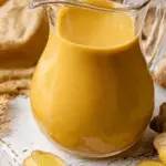 A clear glass pitcher filled with a thick, smooth golden-yellow sauce sits on a rustic white wooden board with chipped paint. Surrounding the pitcher on a white marbled surface are pieces of fresh ginger root, some whole and some sliced, showing their light yellow interior. A textured light brown-yellow cloth with fringed edges is placed next to the board. The image captures warm, natural tones and has a clean, fresh feel. photo taken with an iphone --ar 4:5 --v 7