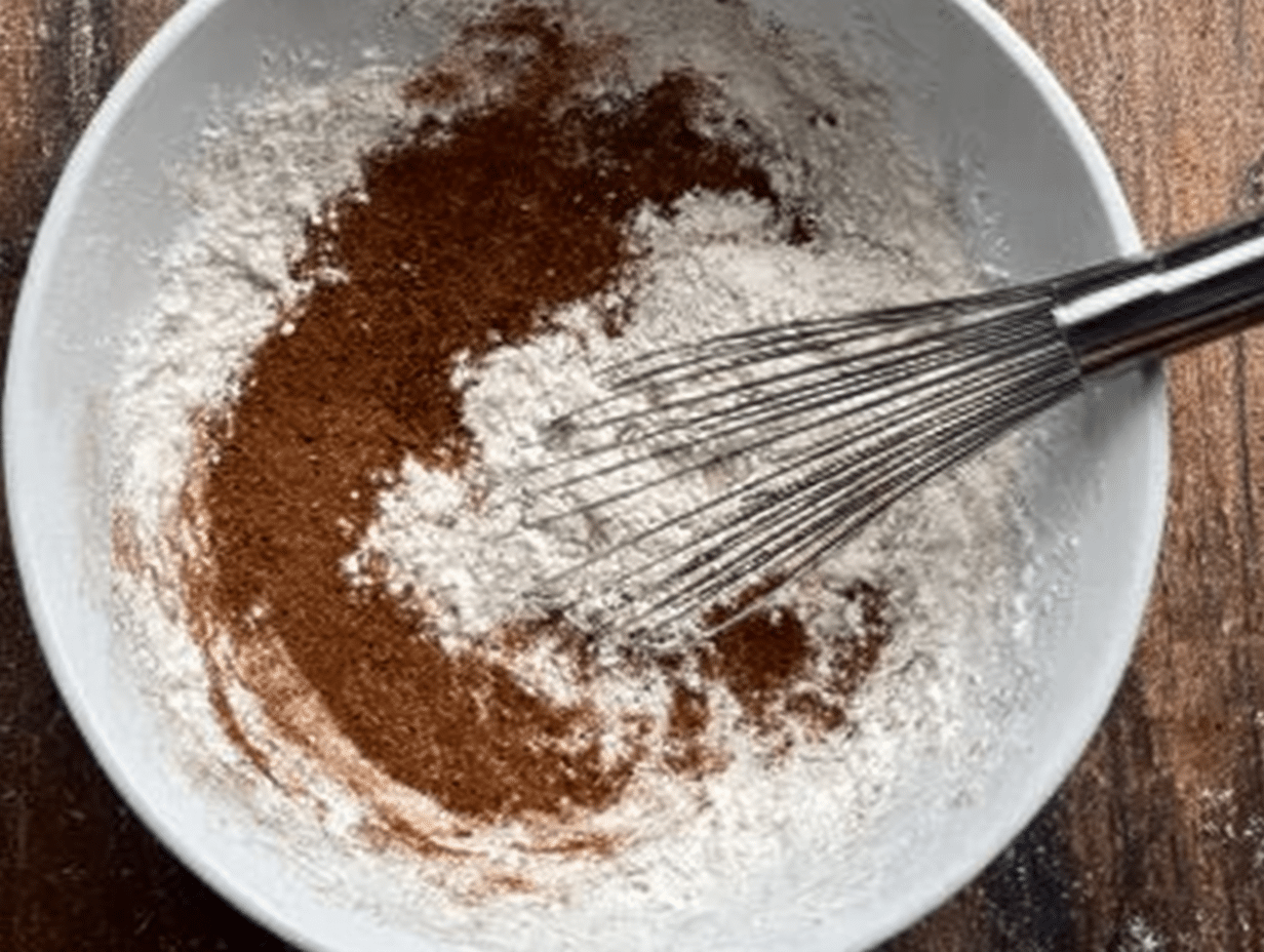 - In another bowl, I sift together the flour, baking powder, baking soda, salt, cinnamon, and nutmeg.
