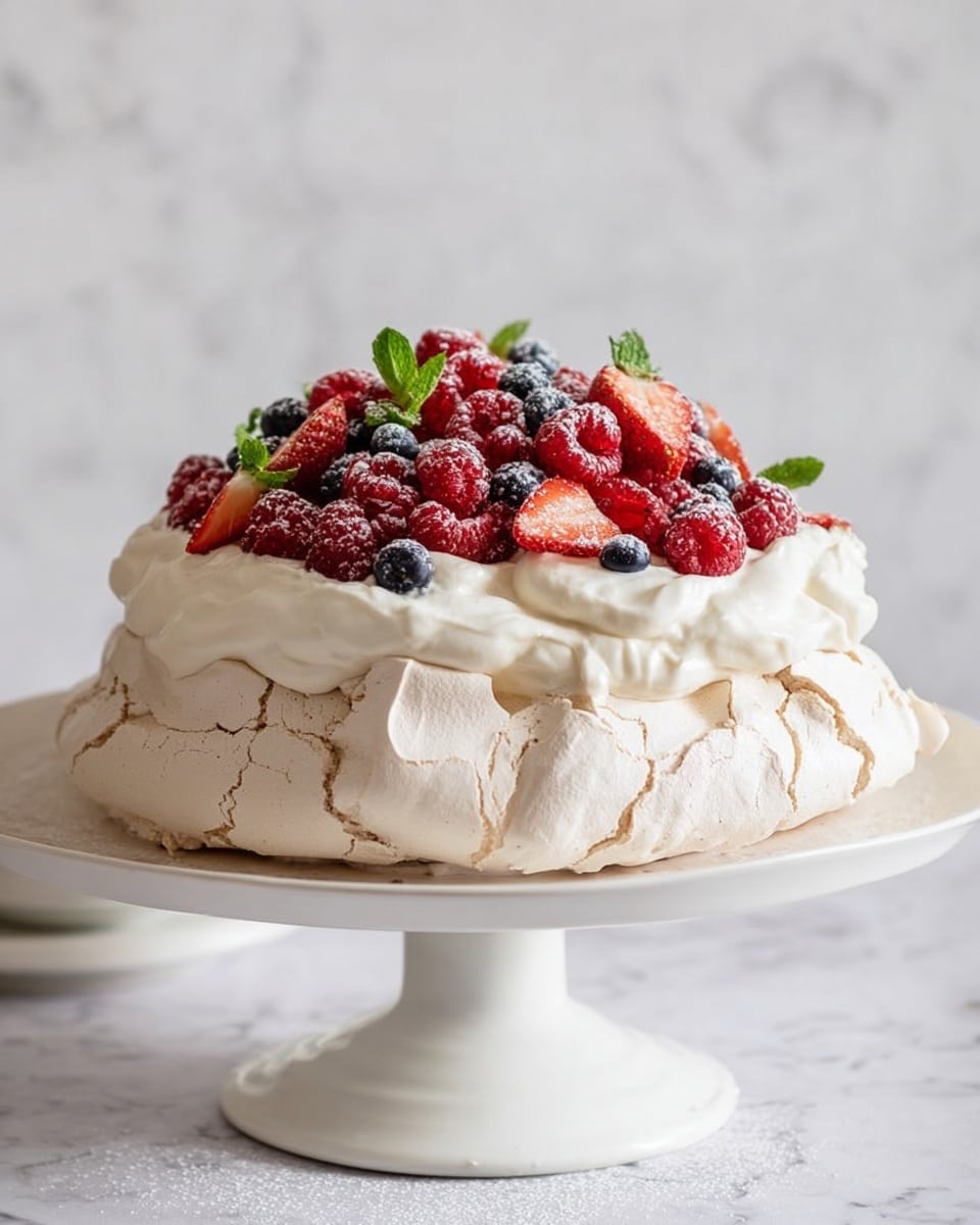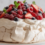 I love this pavlova because it’s both elegant and simple to make. The meringue looks impressive but requires just a few pantry staples, and the whipped cream and fruit topping make it fresh and vibrant. The combination of crisp exterior, creamy center, and juicy fruit is irresistible. It’s ideal for celebrations, summer desserts, or any time I want something light yet indulgent.