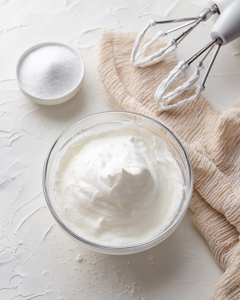 - In a large, clean mixing bowl, I beat the egg whites on medium speed until soft peaks form.
