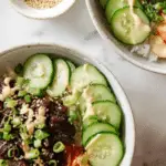 This Korean Ground Beef Bowls recipe is a delicious and quick meal featuring flavorful ground beef cooked in a savory-sweet sauce with garlic and ginger, topped with spicy mayo and served over steamed rice with fresh cucumbers, kimchi, green onions, and sesame seeds. Perfect for a satisfying weeknight dinner or meal prep.